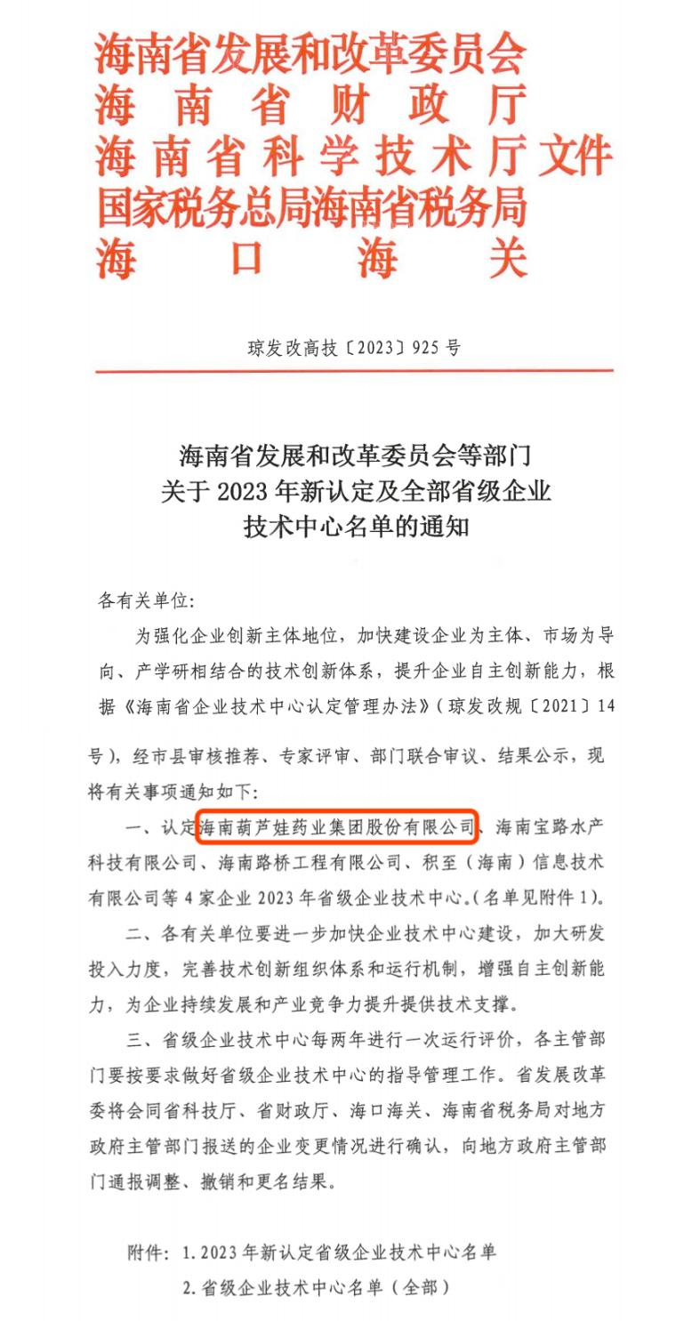 近日,海南省发改委等多部门联合公布了《关于2023年新认定及全部省级企业技术中心名单的通知》,其中,海南918搏天堂药业集团股份有限公司成功通过评审,被认定为省级企业技术中心,是本次获批的4家企业之一。